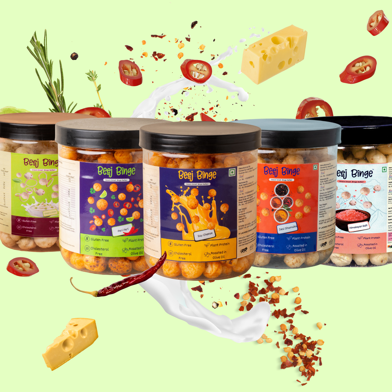 Snack smarter with Beej Binge’s Combo of Four Makhanas – a curated selection of our most-loved flavours, crafted for those who crave variety without compromising on health. Each pack is made from premium, handpicked makhanas, lightly roasted to perfection and seasoned with clean, wholesome ingredients.